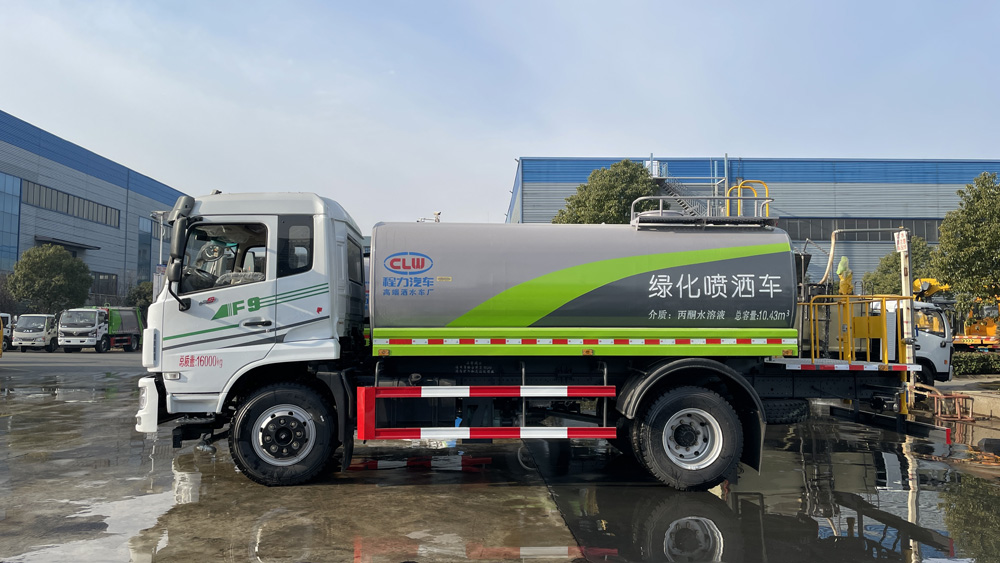 該車僅采用3950mm軸距,主要用于灑水及園林綠化。主要專用裝置由罐體、噴灑系統組成。罐體總容量:10.43立方米,有效容積:9.95立方米,介質:丙酮水溶液.密度:950千克/立方米,罐體尺寸(長×寬×高)為(mm):4200×2350×1500;